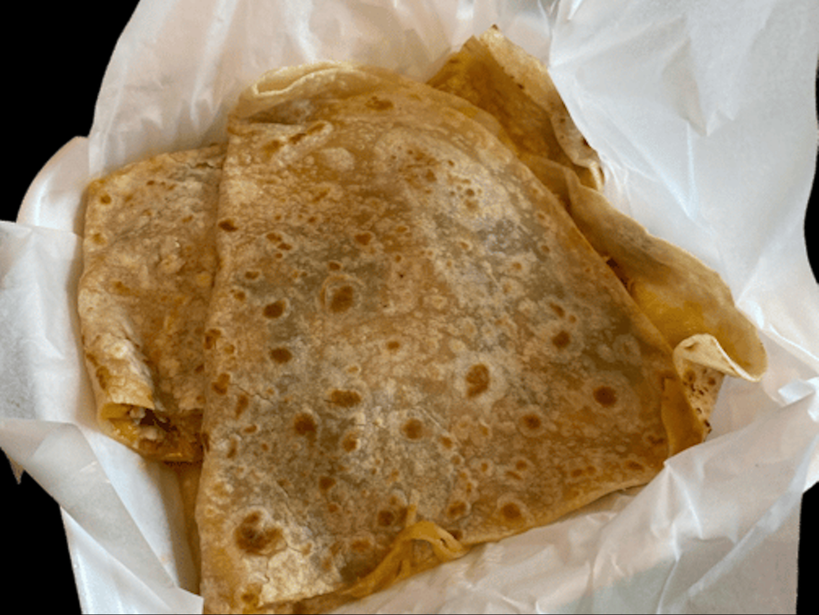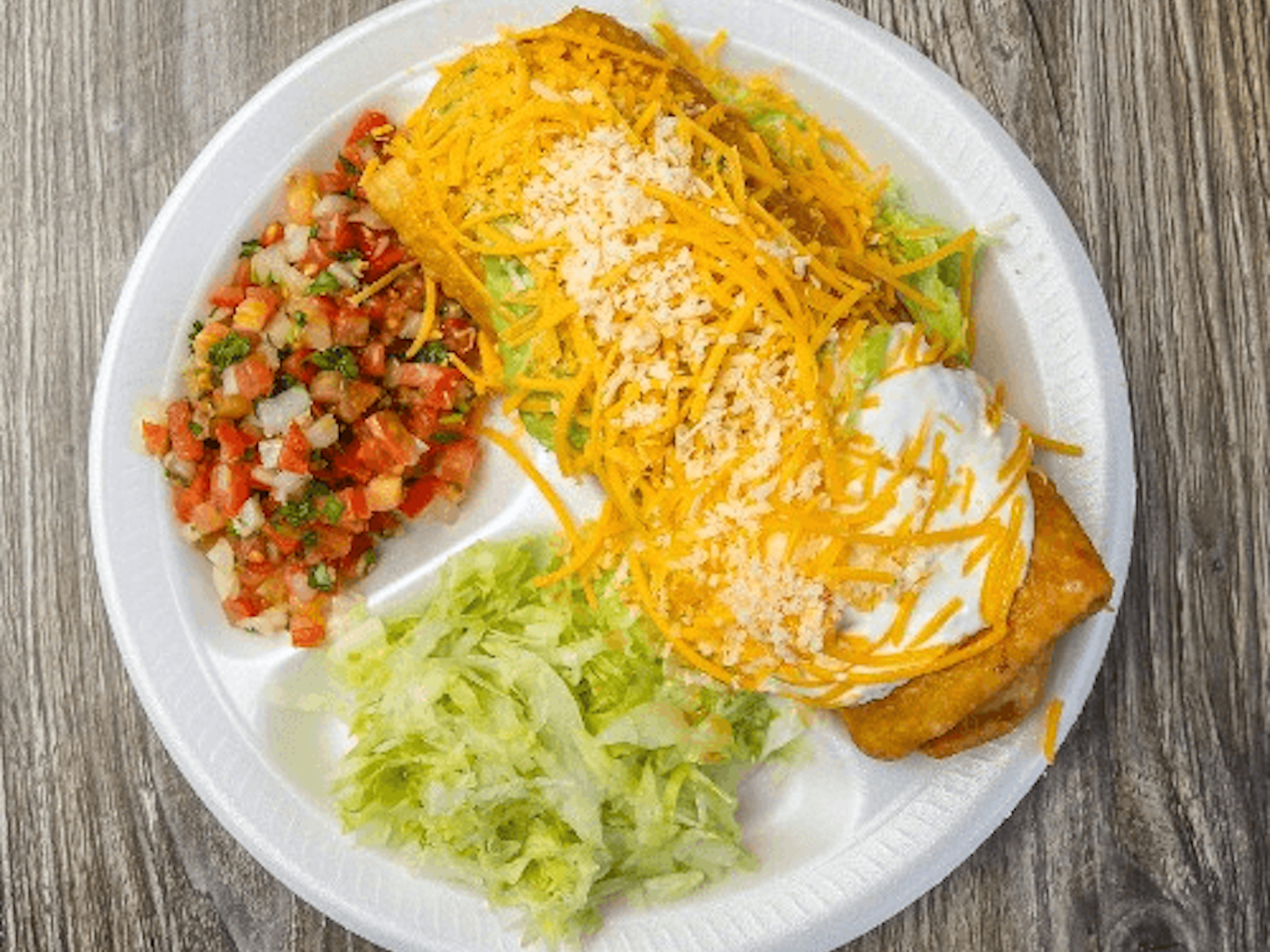 W/Beans & Cheese Inside. Guacamole, Sour Cream, Cheese and Cotija on Top. Lettuce and Salsa Fresca(Pico) on the plate.