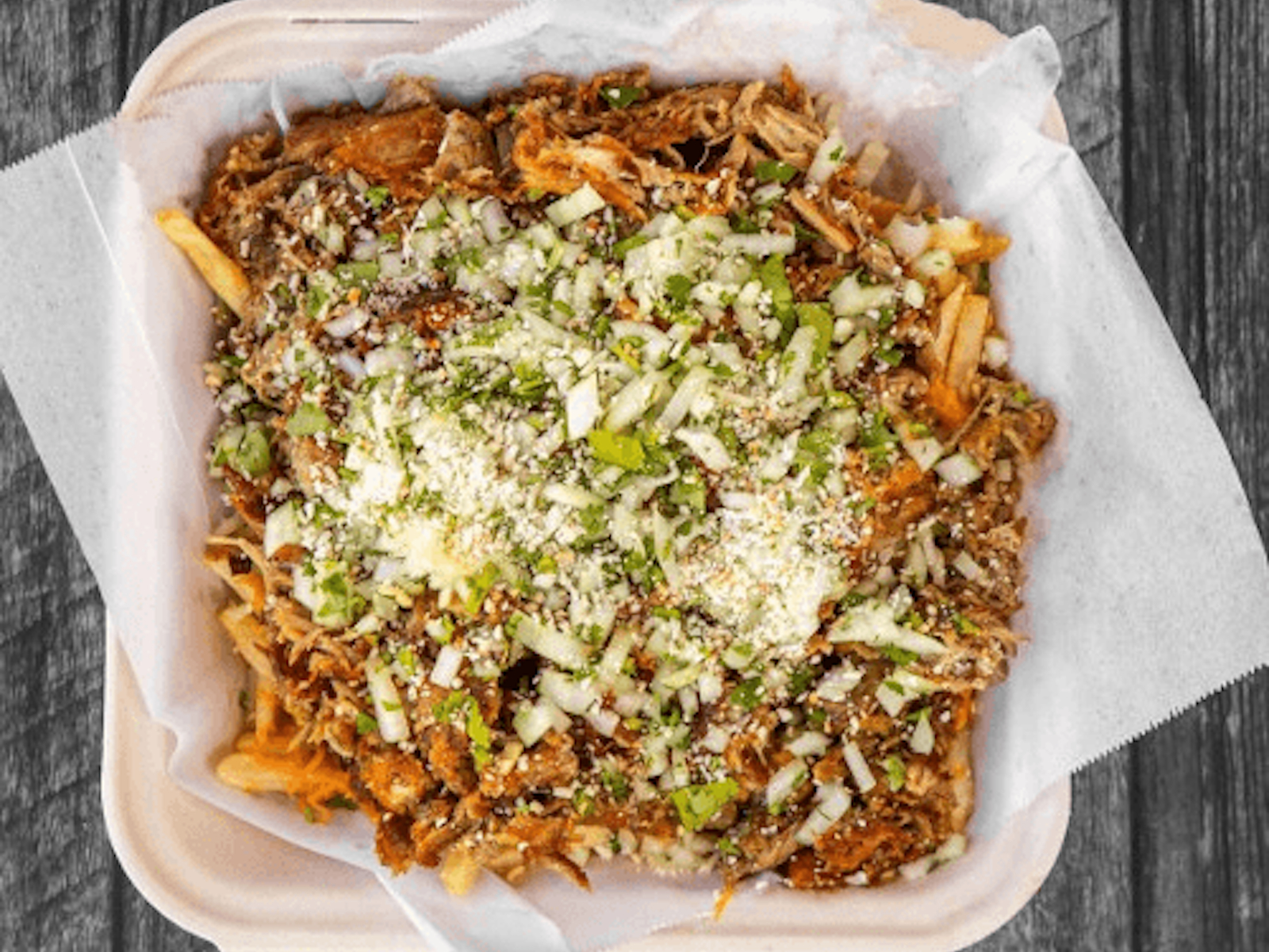 Carnitas, fries, cheese.