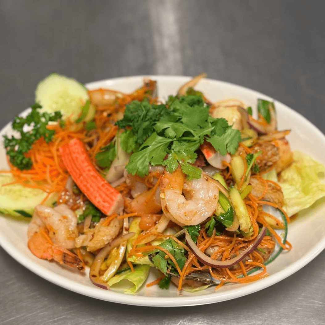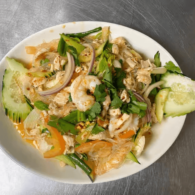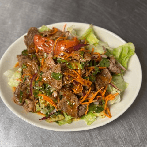 Your choice of chicken, pork, or beef with onions, cilantro, lettuce, in lime dressing and roasted rice powder