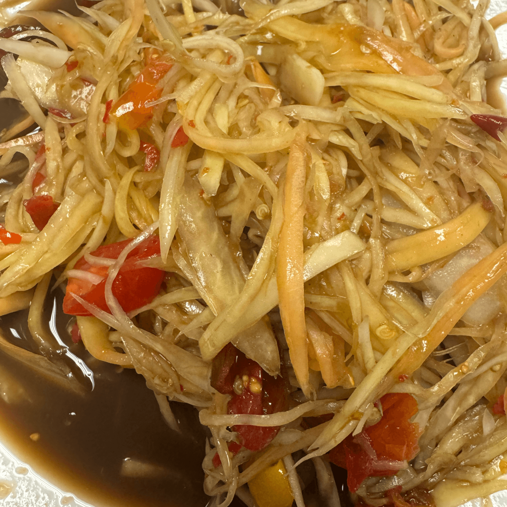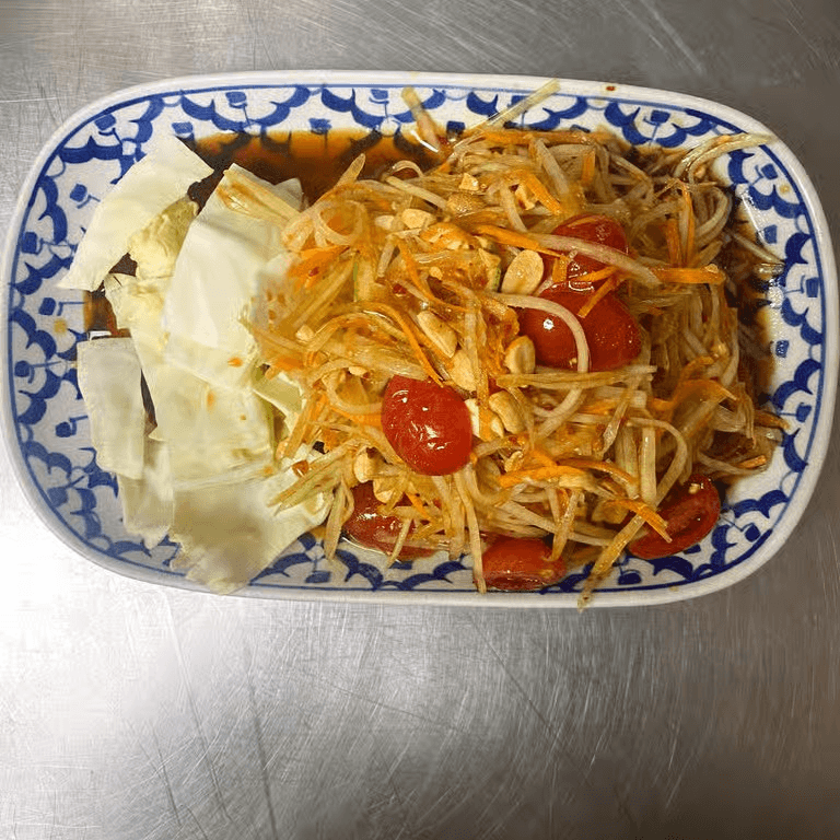 Shredded green papaya mixed with chili, lime juice, fish sauce, tomato with crushed peanuts