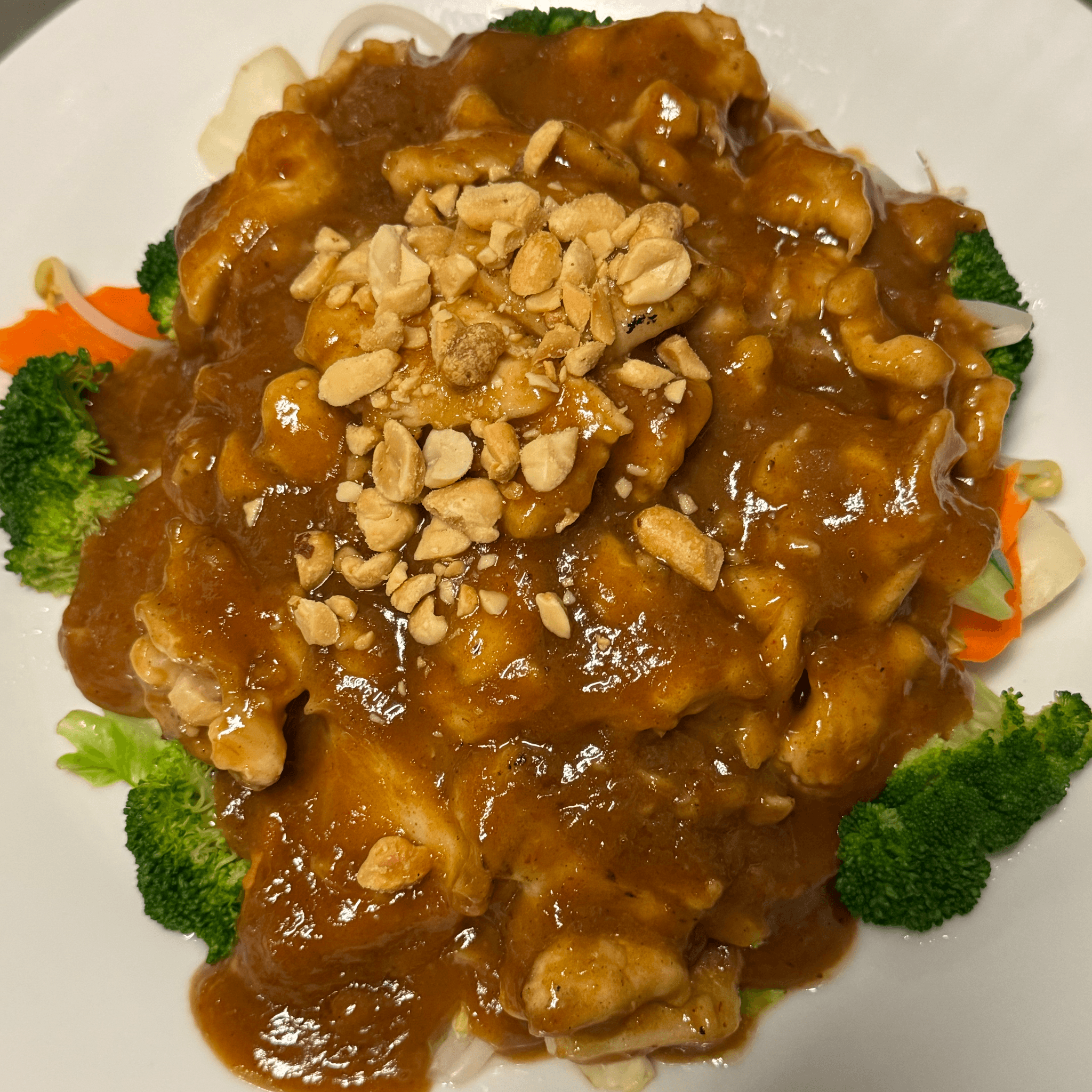 Stir-fried choice of meat in peanut sauce served on top of steamed broccoli, carrots, bean sprouts and cabbage