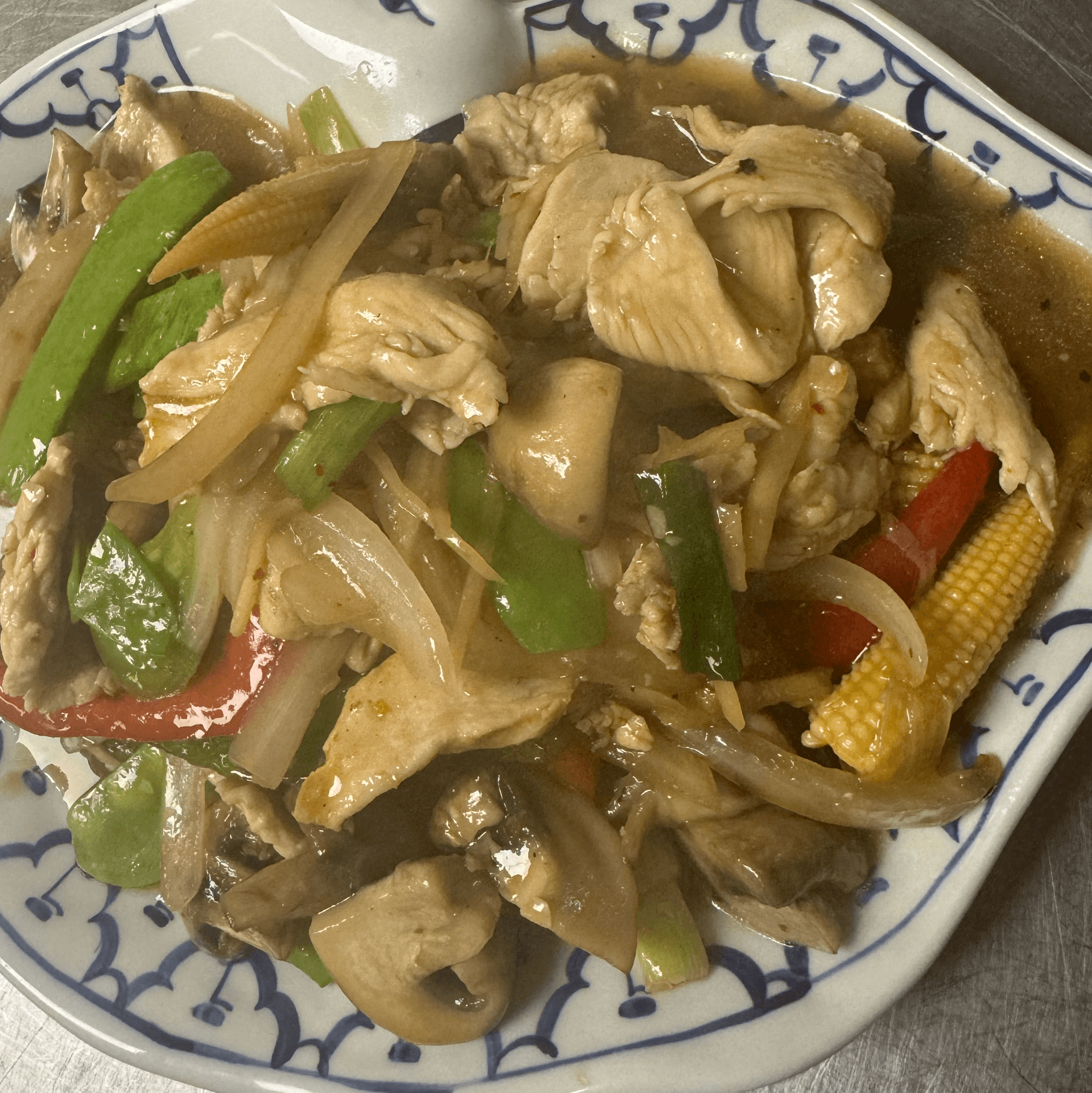 Stir-fried onions, bell pepper, mushroom, ginger, baby corn, snow peas in our house-made sauce