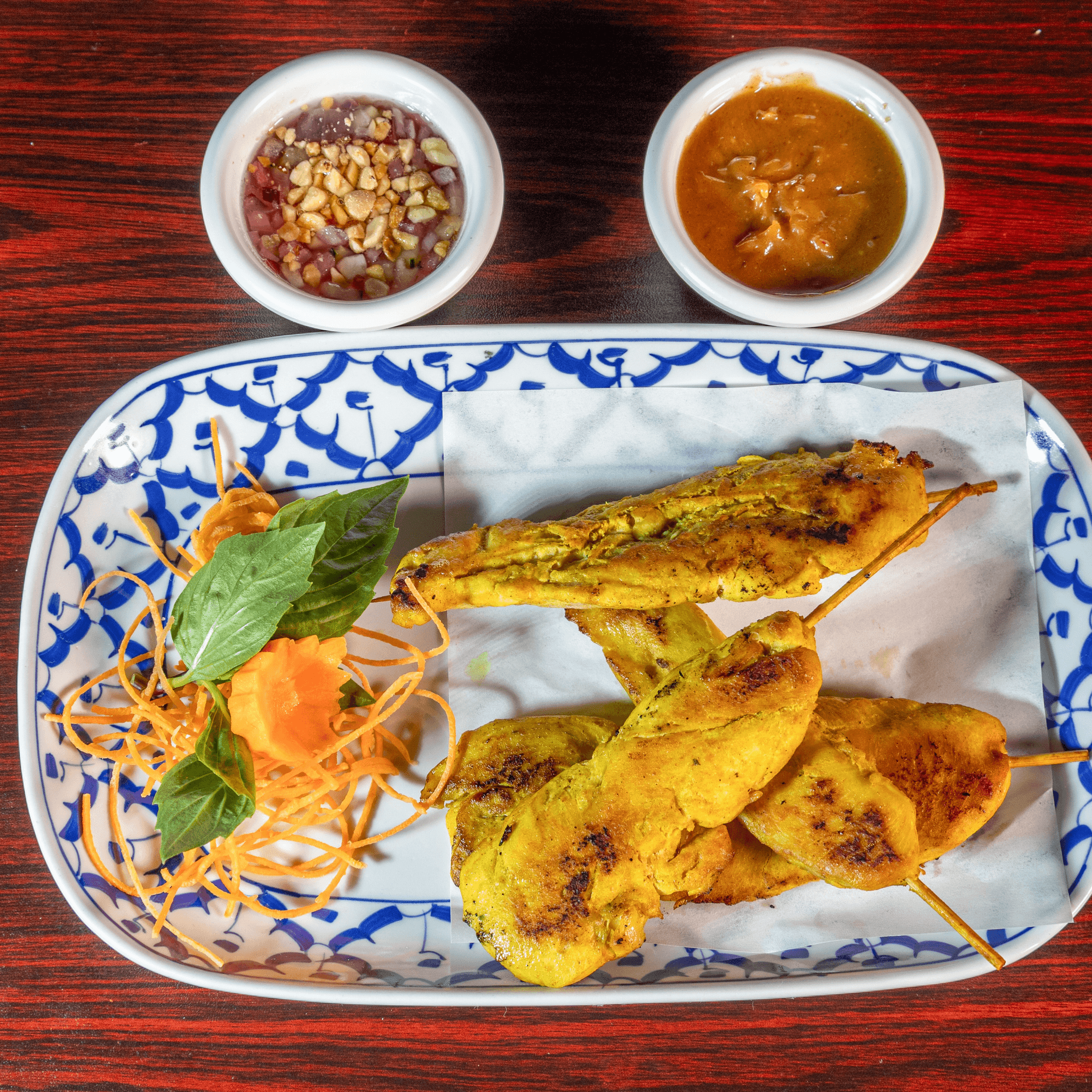 (4). Traditional Thai style grilled chicken on the skewer, seasoned with curry powder and coconut milk. Served with peanut sauce and cucumber sauce