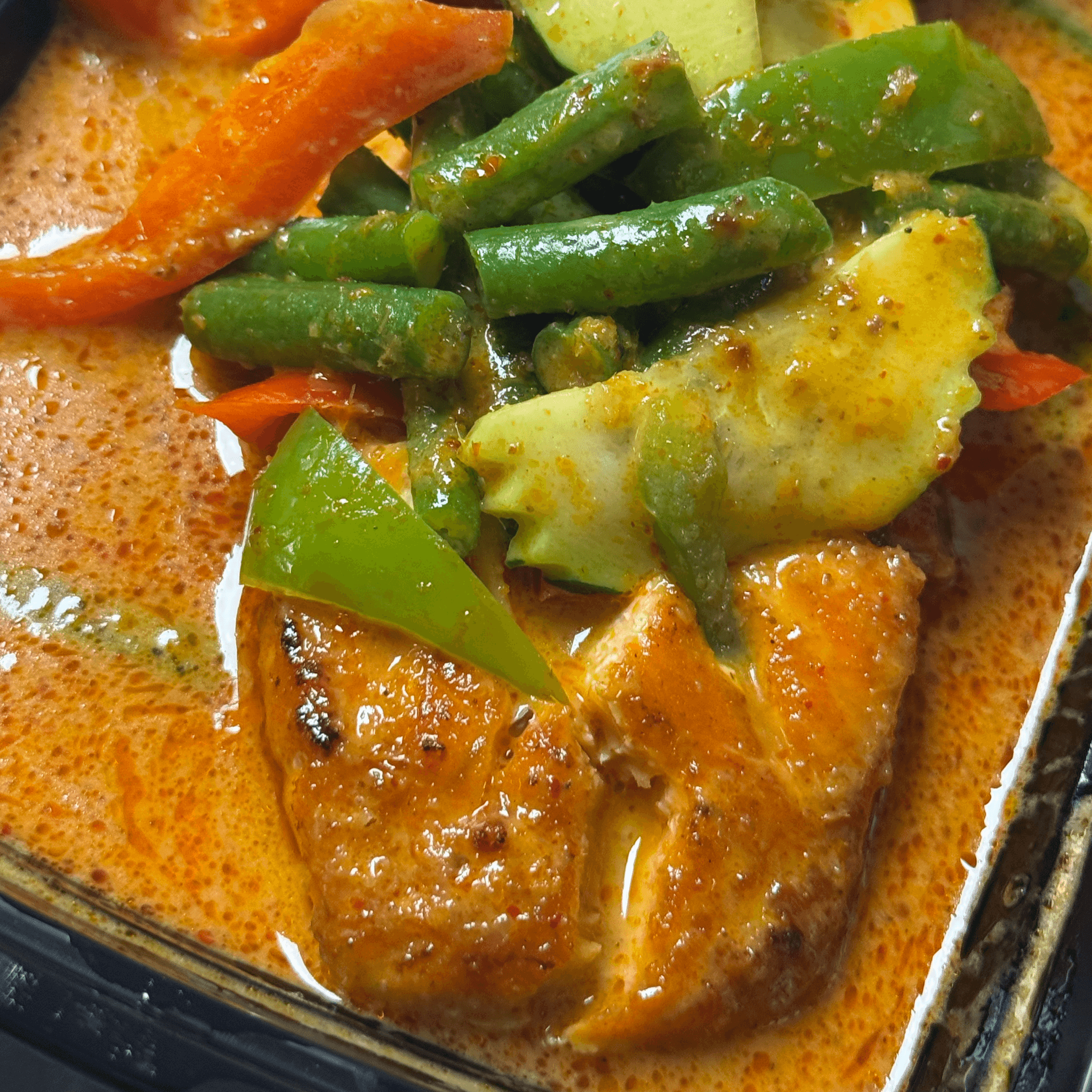 Grilled salmon fillet, bell peppers, zucchini, green beans in a spicy panang curry sauce