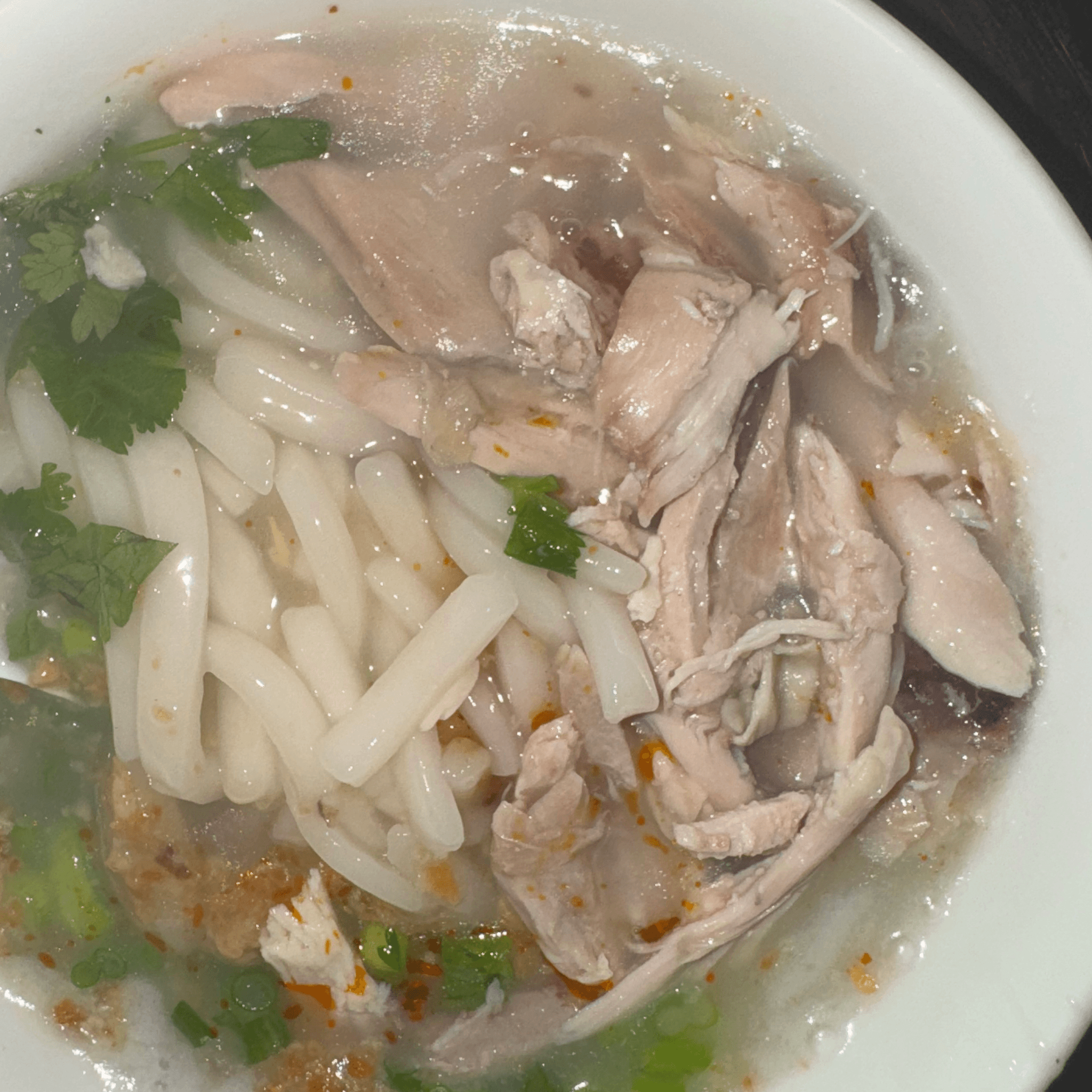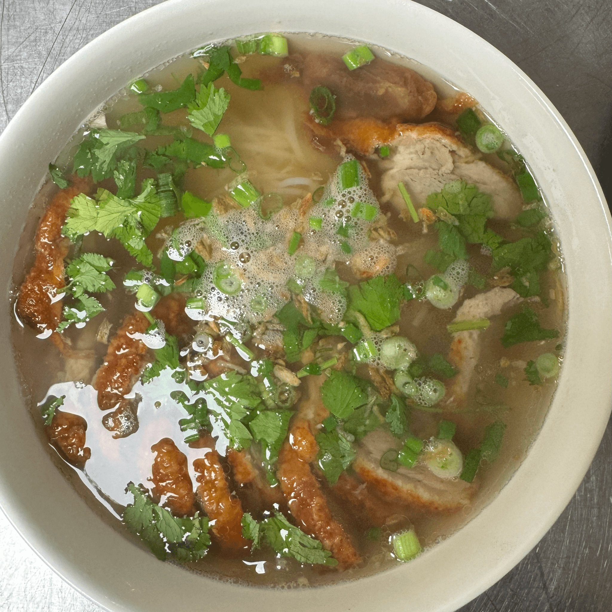 Rice noodles, bean sprouts, onion, cilantro, fried garlic in house special clear broth