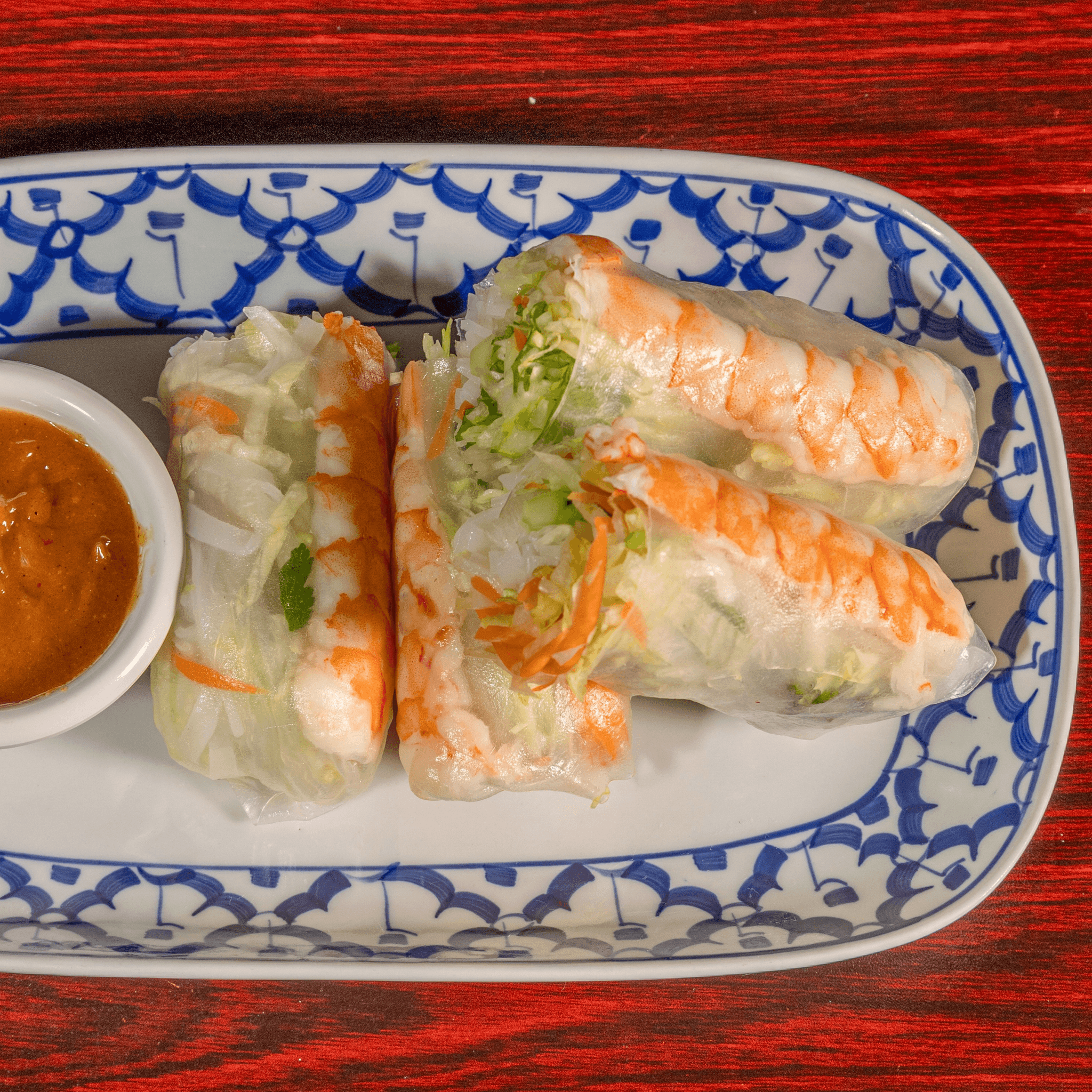 Soft rice paper rolls with lettuce, cucumber, cilantro, rice noodle served with peanut sauce
