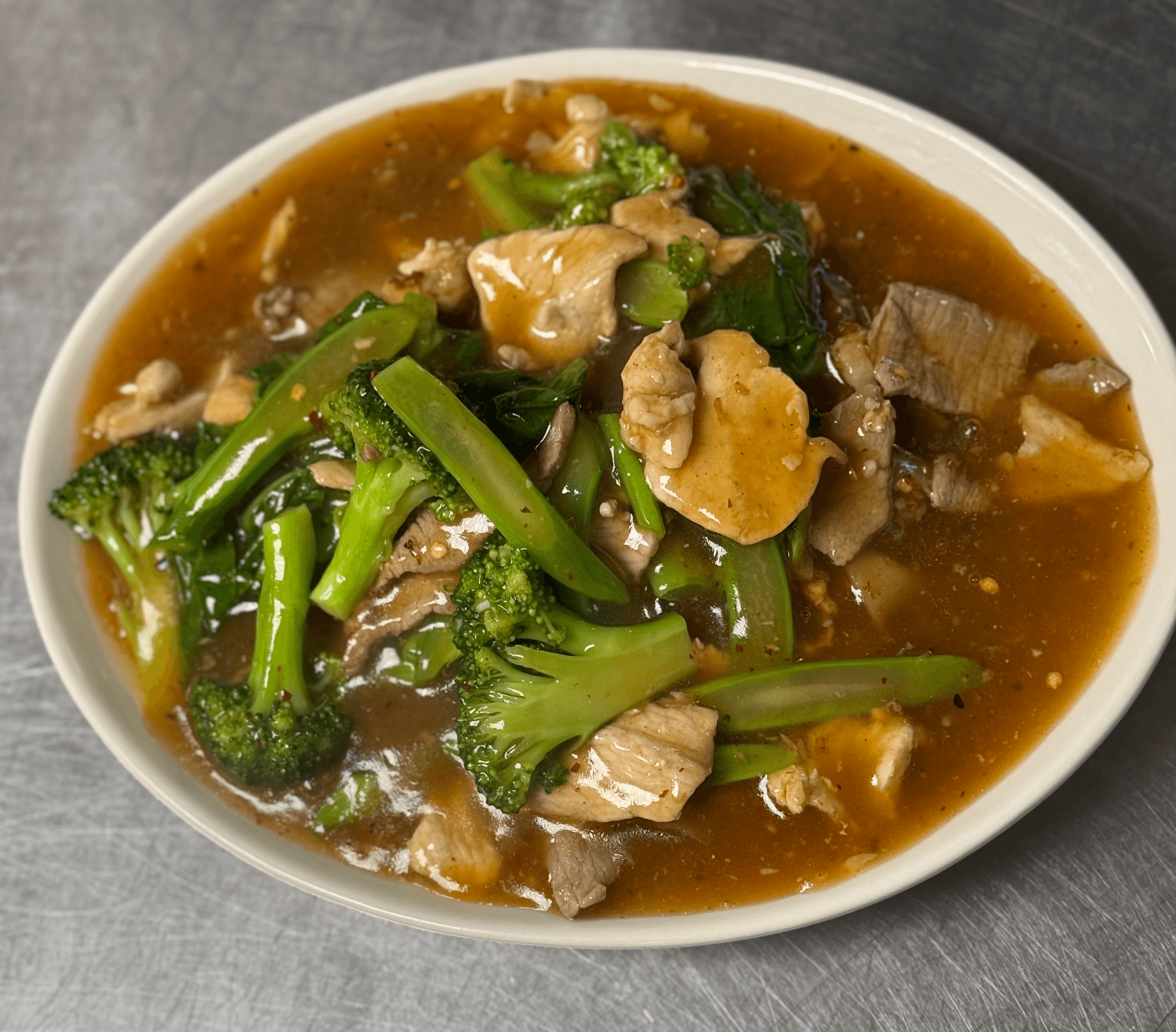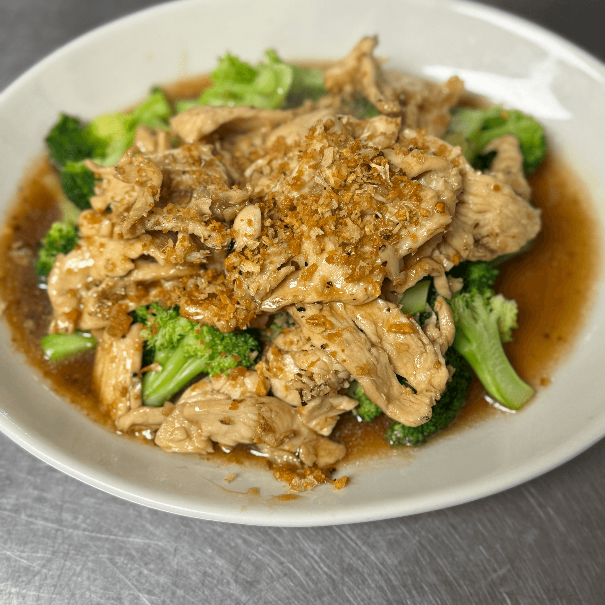 Stir-fried choice of meat, served with steam broccoli with fried onion