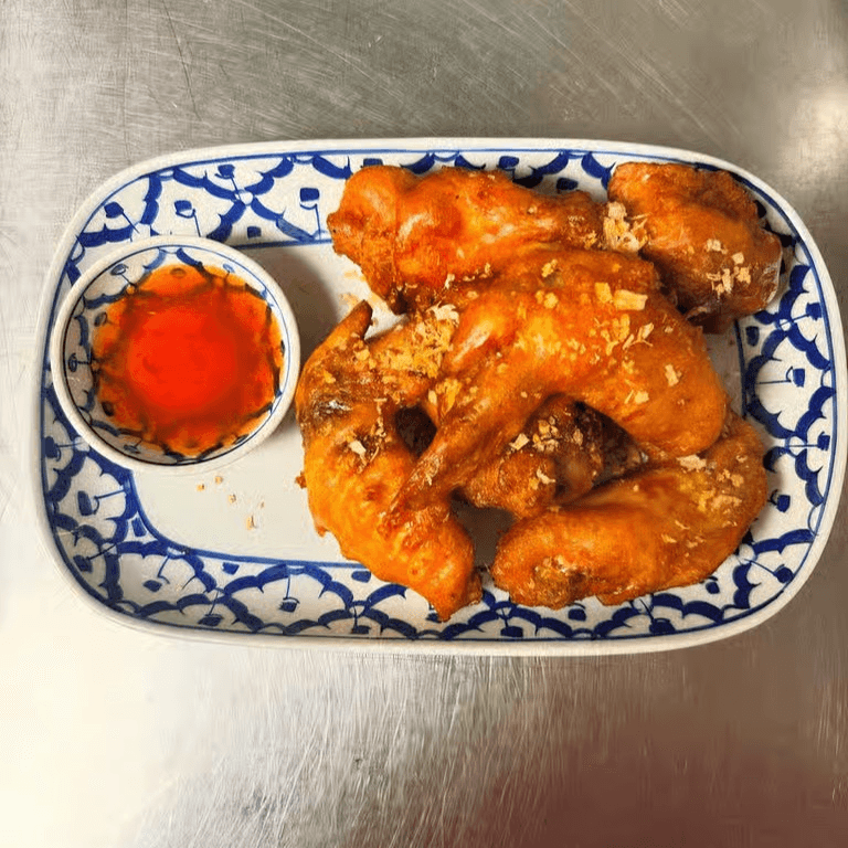 (5) Deep fried chicken wings served with a side of sweet chili sauce