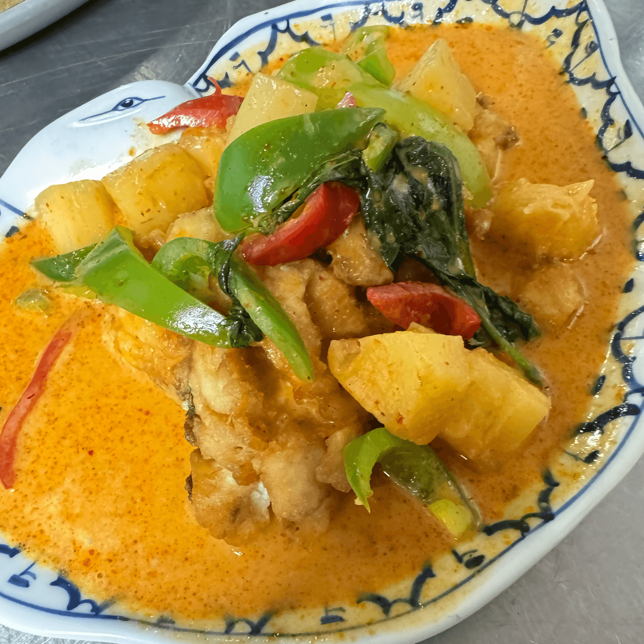 Red snapper fillet simmered with red curry sauce pineapple red and green bell peppers, and basil
