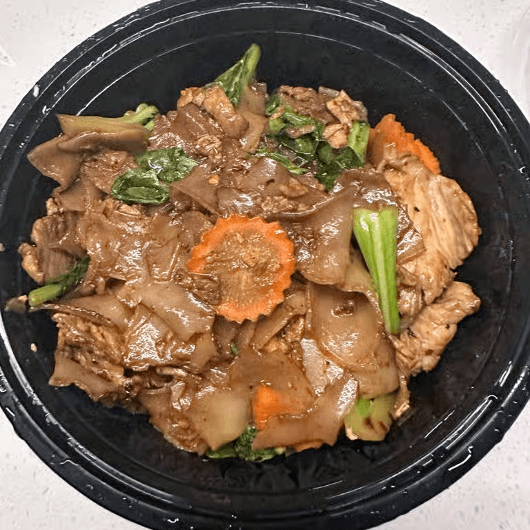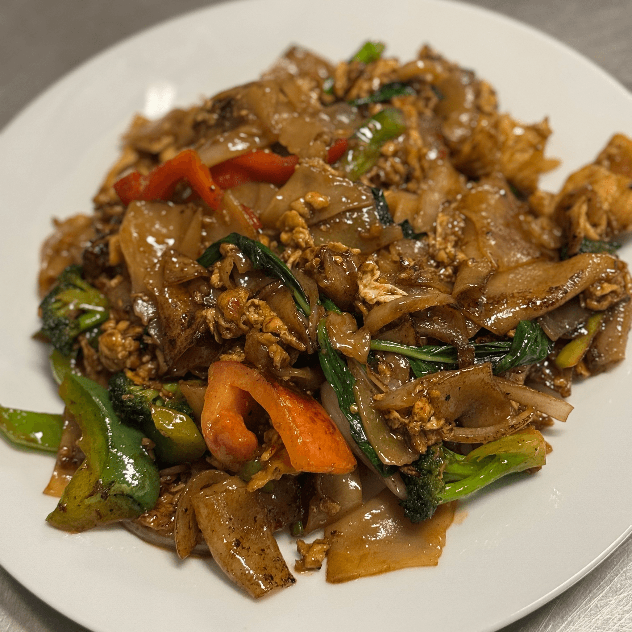 Wok-stir-fried flat noodles cooked in our house-made sauce with egg, American broccoli, Chinese broccoli