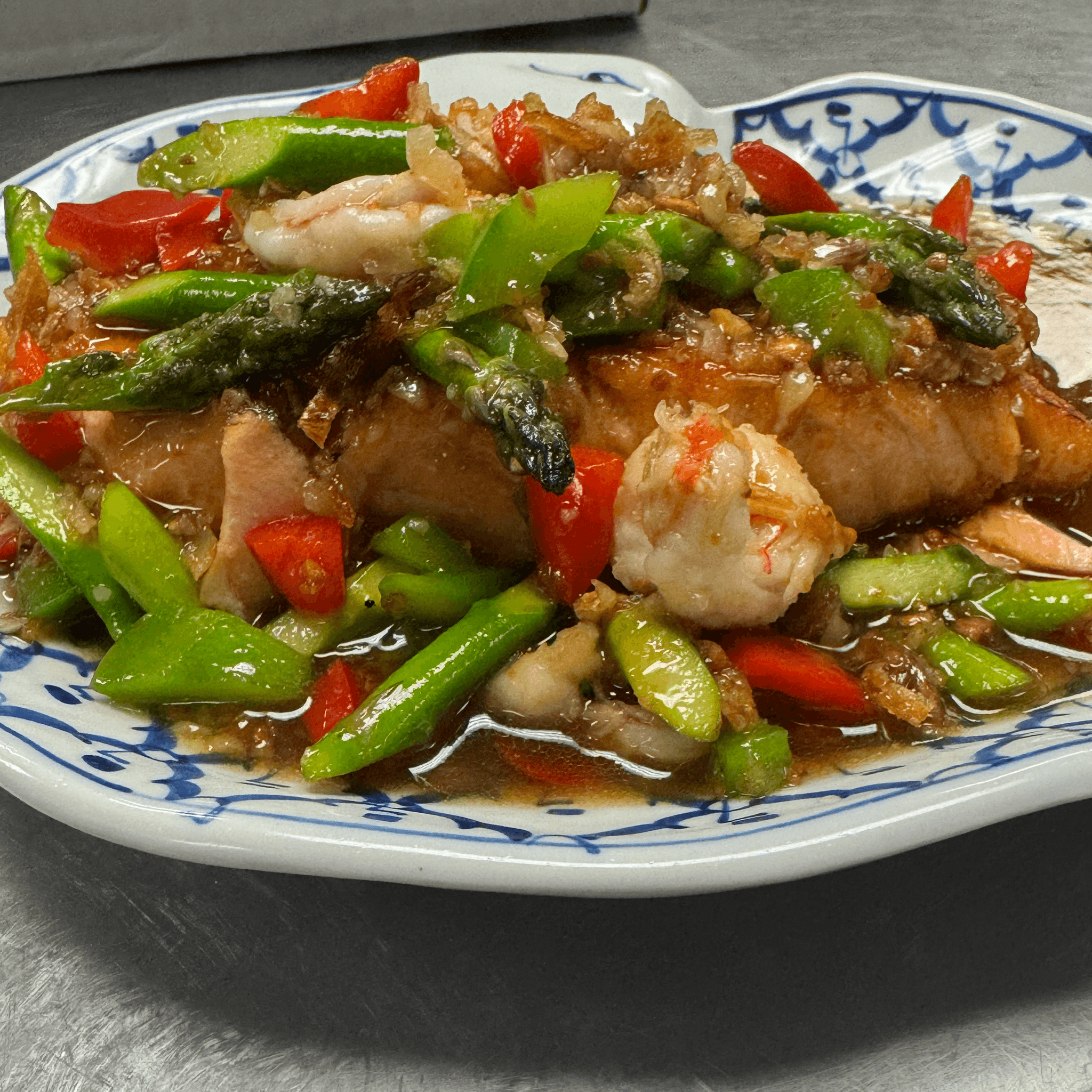 Sautéed asparagus spears, shrimps, onion, bell pepper, fried garlic, cilantro, and garlic sauce served over grilled salmon fillet