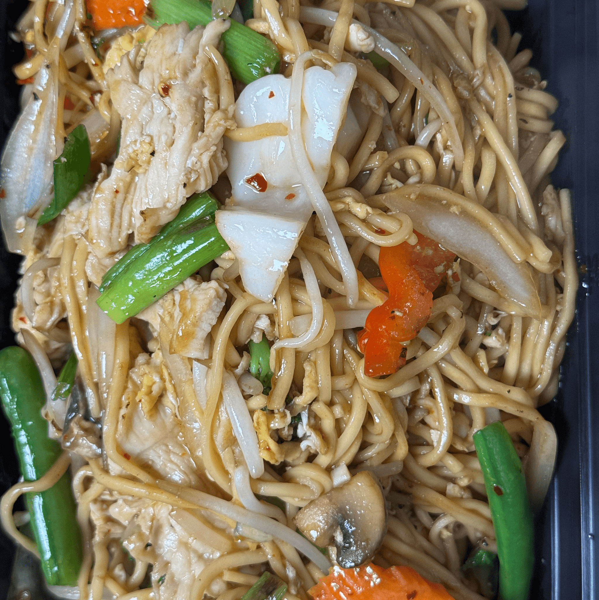 Soft egg noodle sautéed with bean sprout, onion, cabbage, zucchini, bell pepper