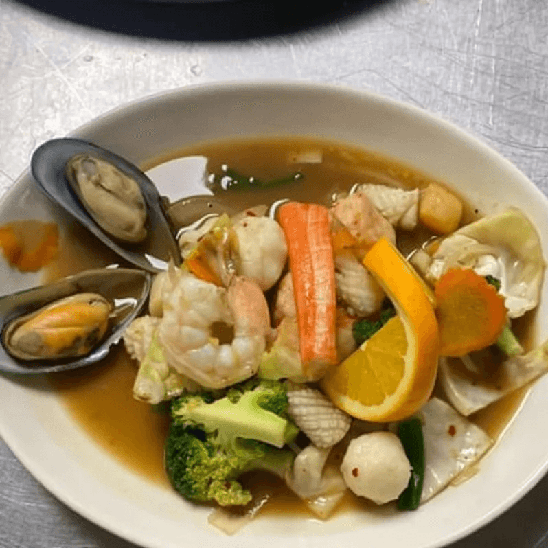 Shrimp, imitation crab meat, squid, mussel, fish ball, sauteed with onions, broccoli, jalapeno, and bell peppers in a garlic basil sauce.
