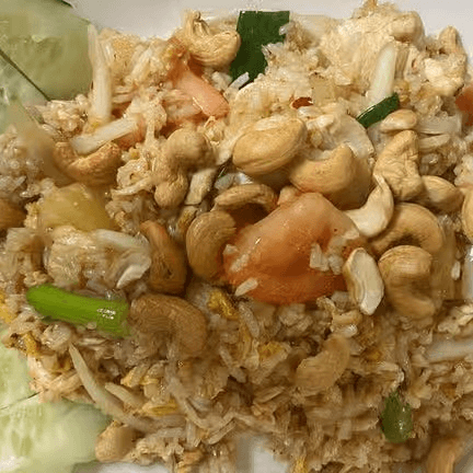 Fresh cracked egg, scrambled with pineapple, cashew nut, and onions wok-fried rice