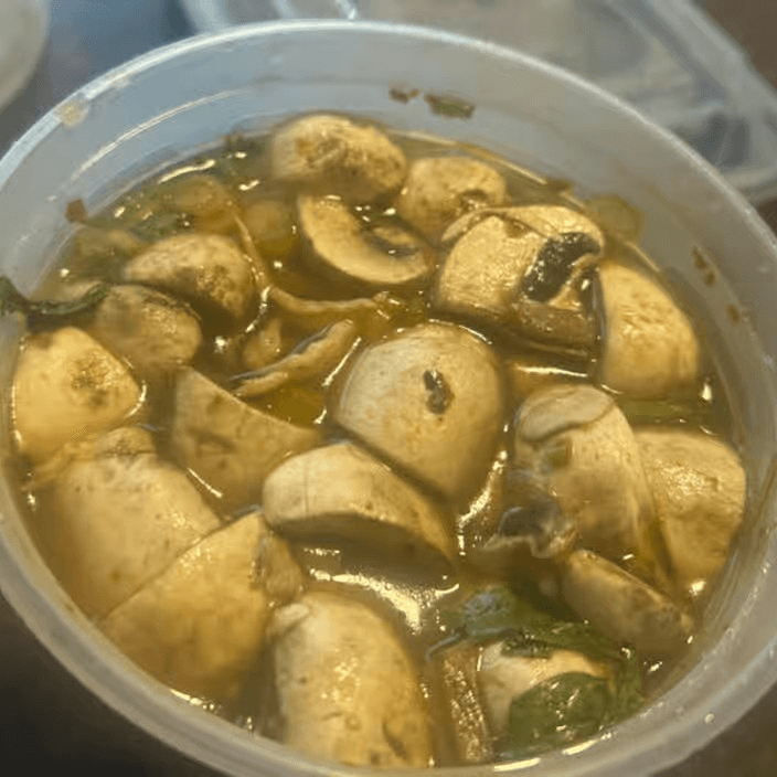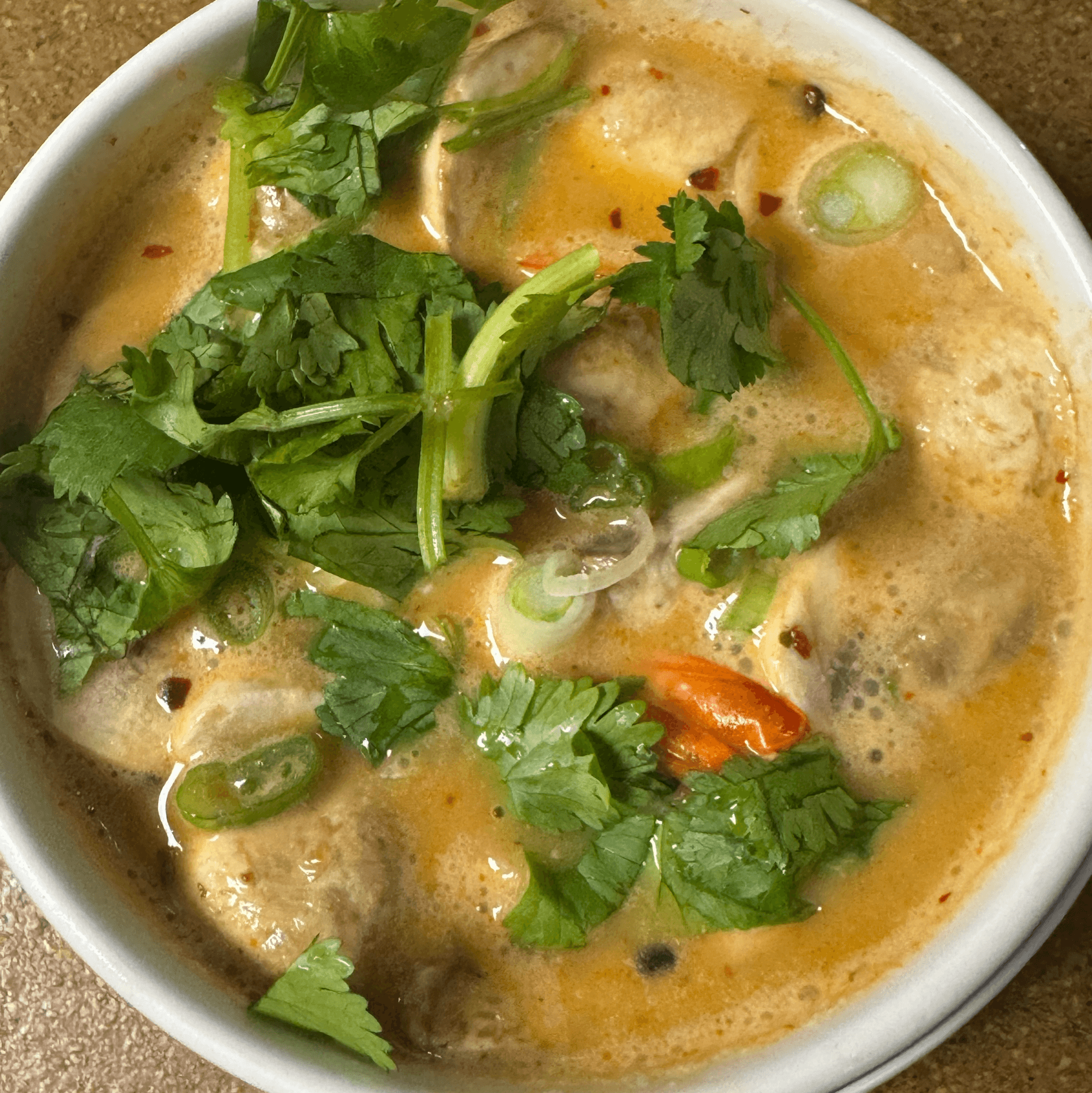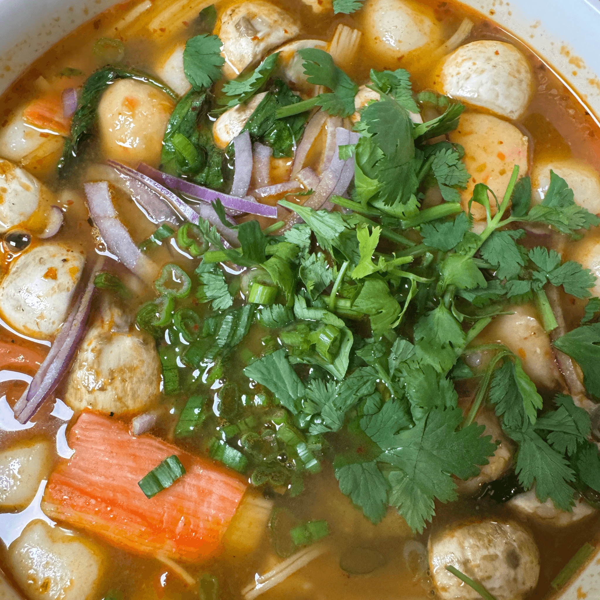 Shrimp, squid, New Zealand mussel, imitation crab, and fish ball. Thai soup with galangal, lime leaves, lemongrass, mushrooms, and coconut milk garnished with onions and cilantro