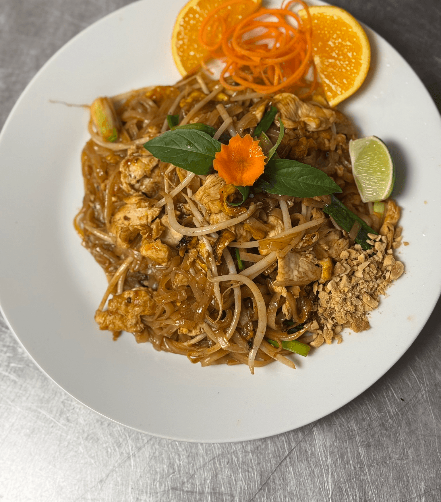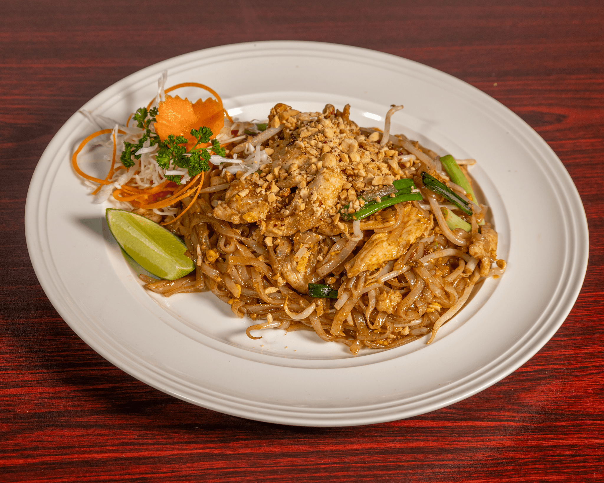 Wok-stir-fried fresh rice noodles tossed in Thai sweet and sour sauce with egg, bean sprout, onions and crushed-roasted peanut top with lime.