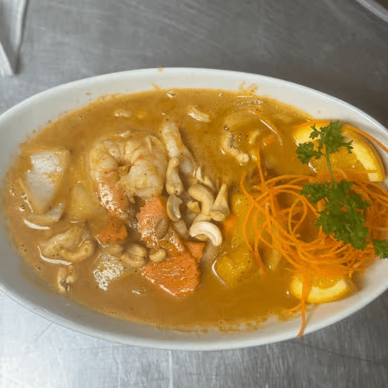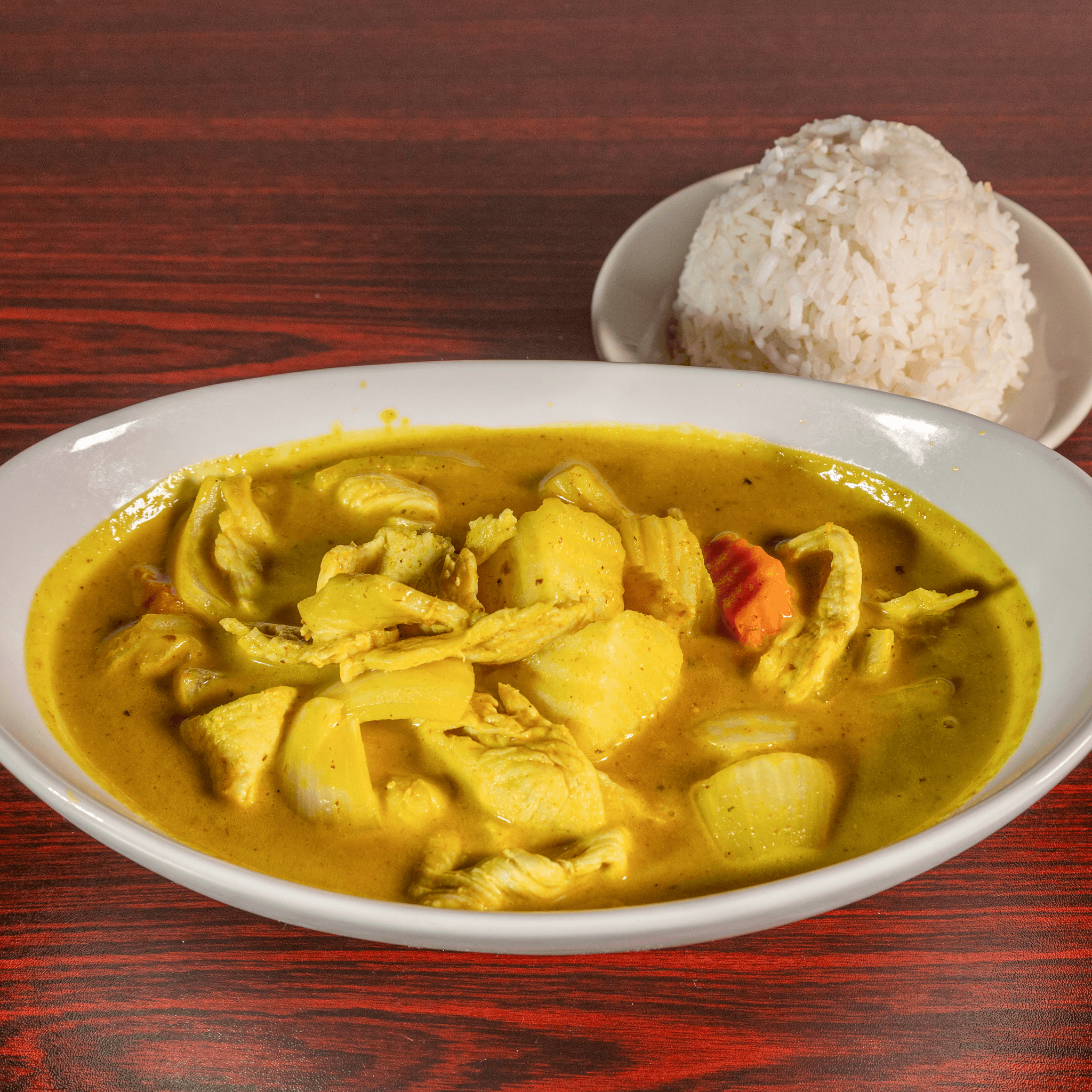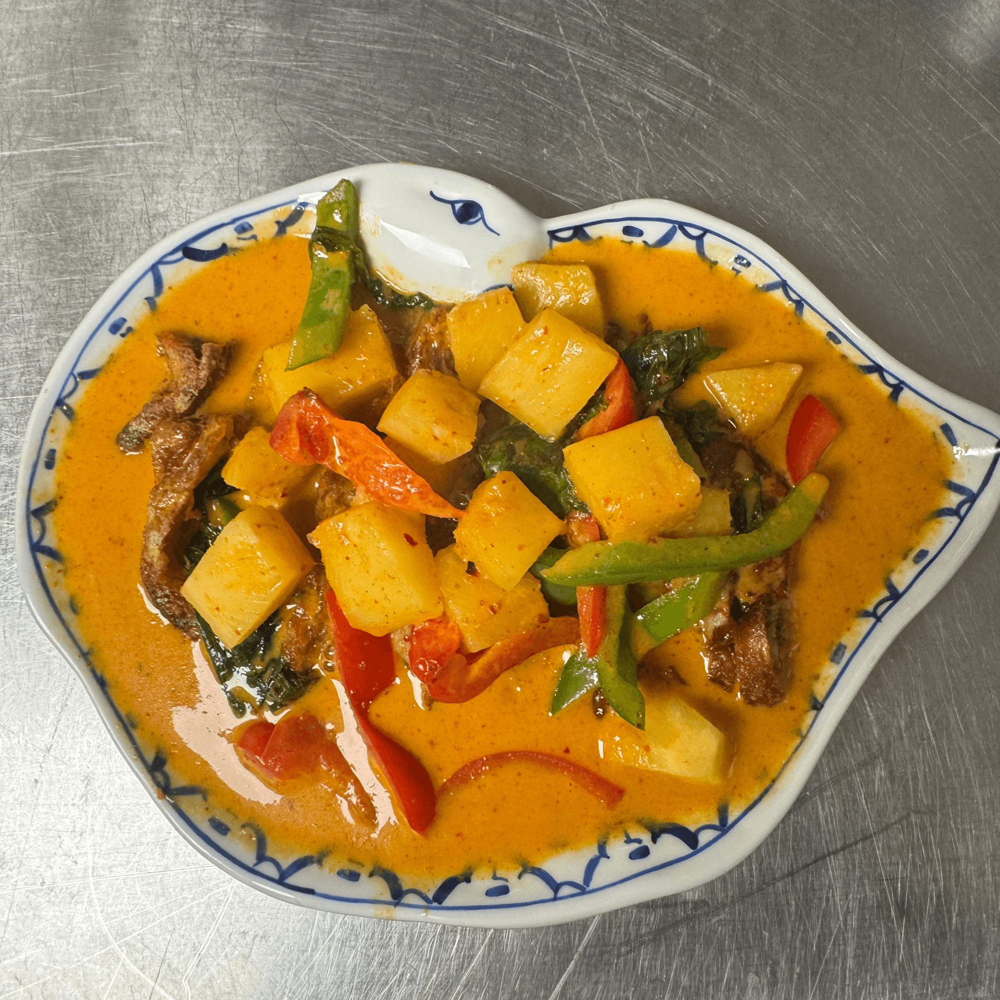 Massaman curry simmered with potatoes, carrots, onions, and cashew nuts