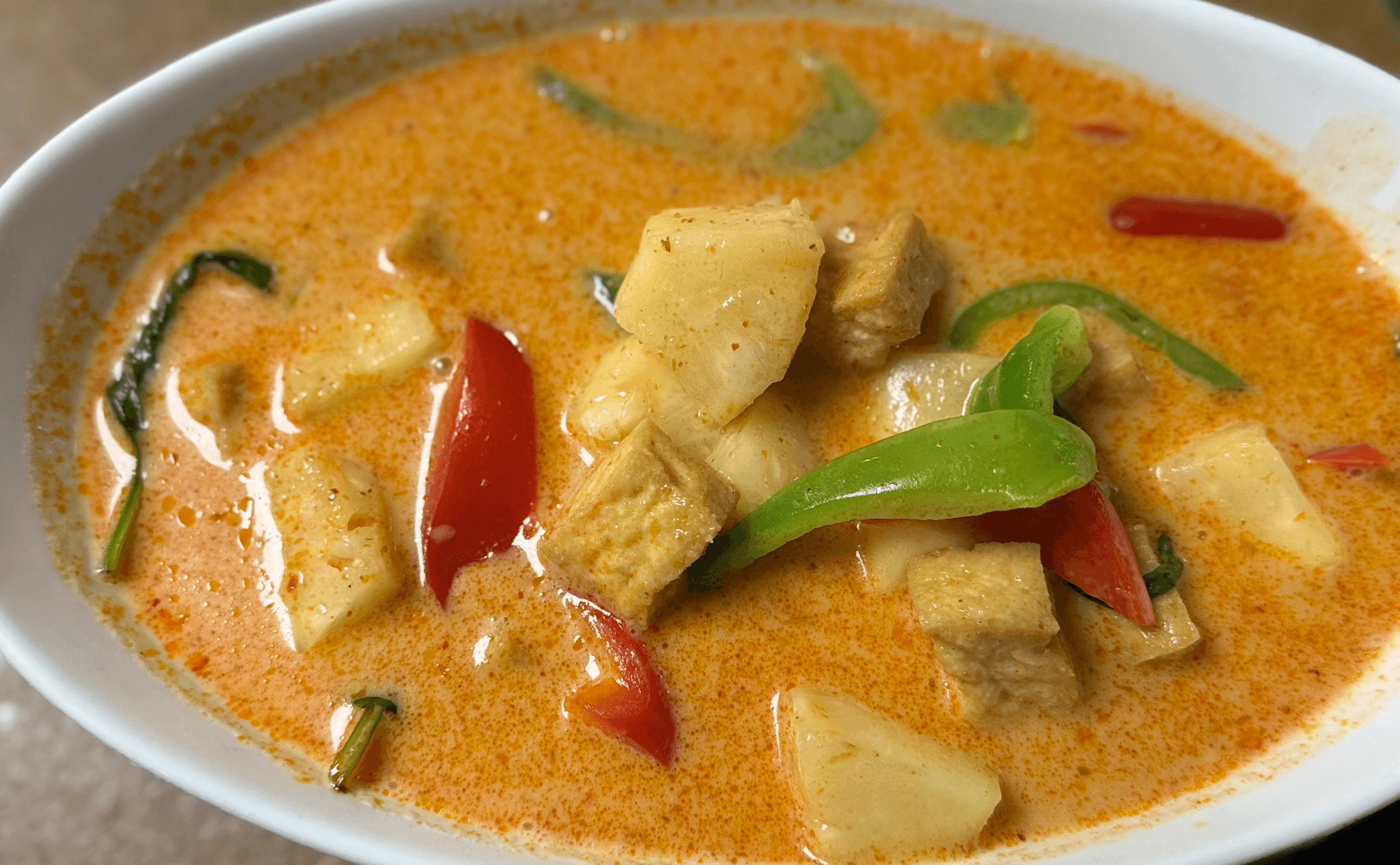 Your choice of meat with red curry sauce pineapple., bell peppers, and basil