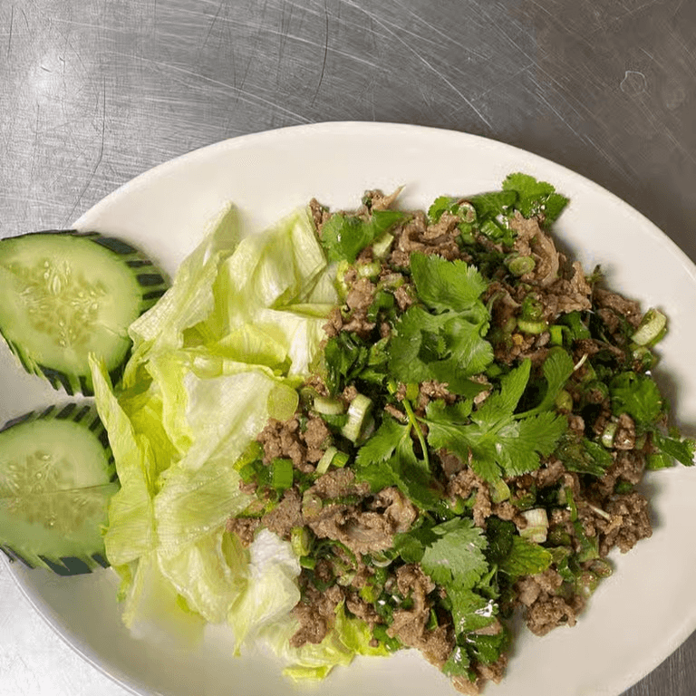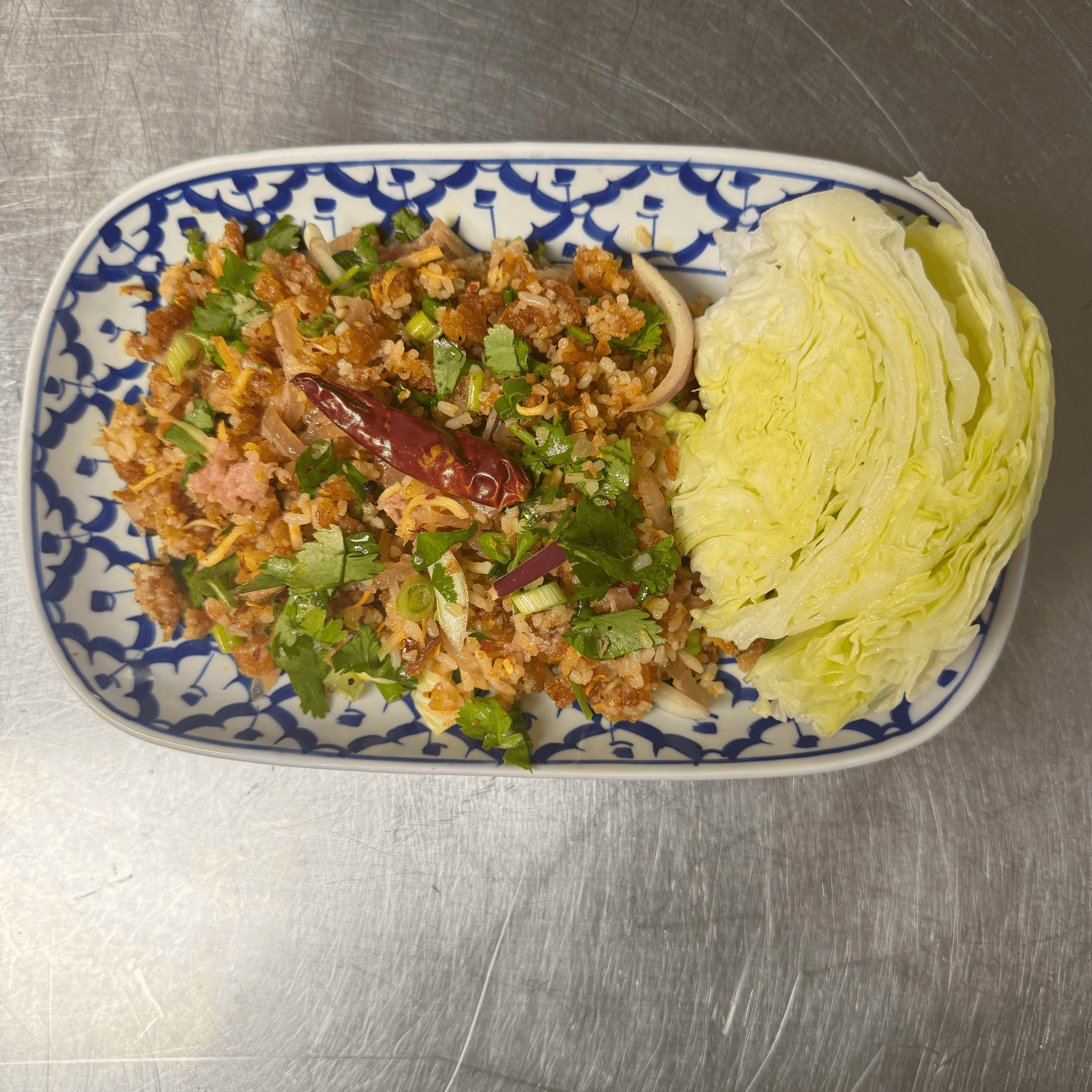 Lao crispy rice salad tossed in peanuts, cured pork, onions, cilantro and lime juice. Served with lettuce