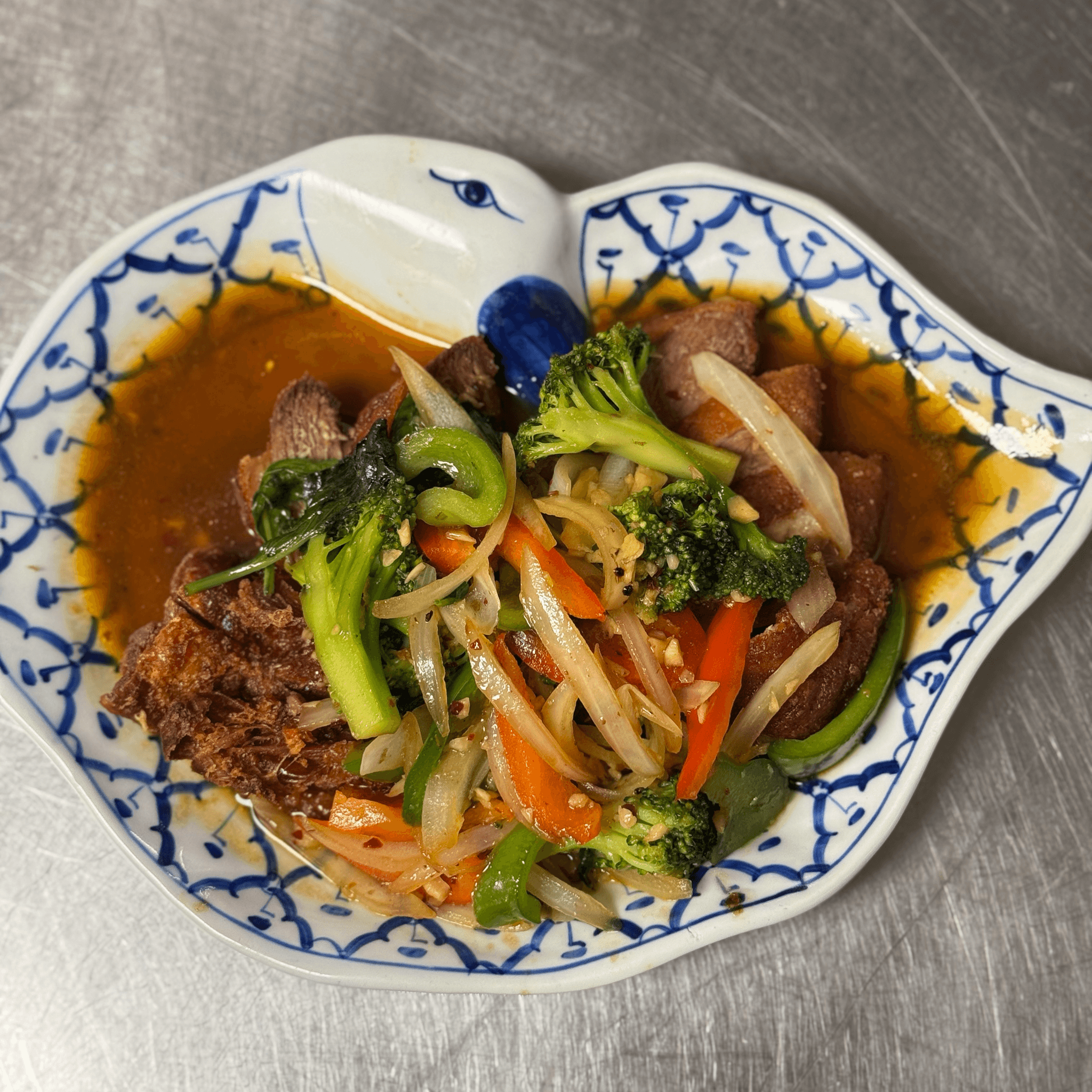 Duck sautéed in a garlic basil sauce, onions, broccoli, jalapeno and bell peppers.