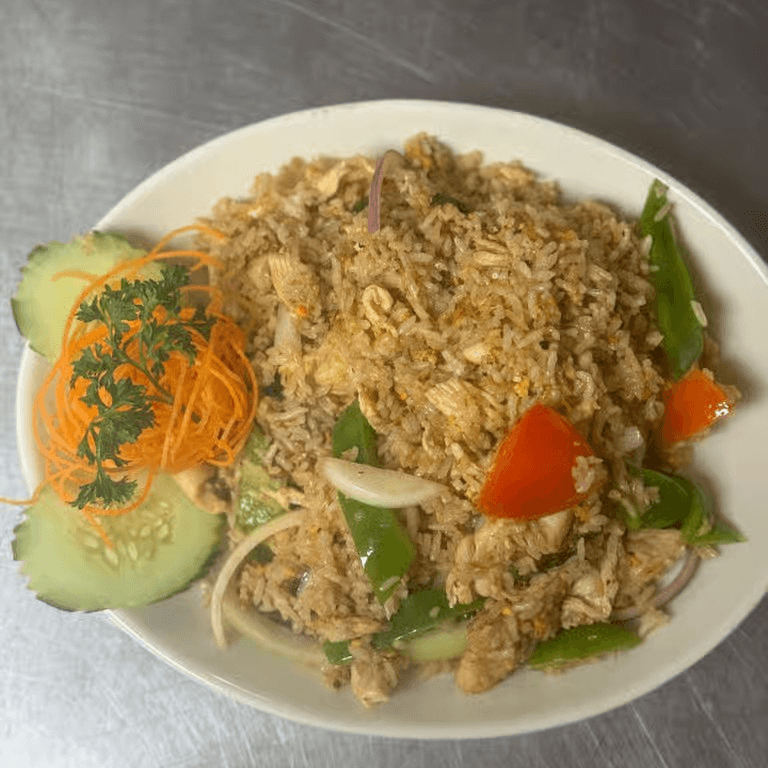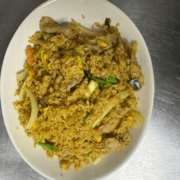 Fresh cracked egg, scrambled with onions, tomatoes, wok-fried rice in our house curry sauce. Wok stir fried rice