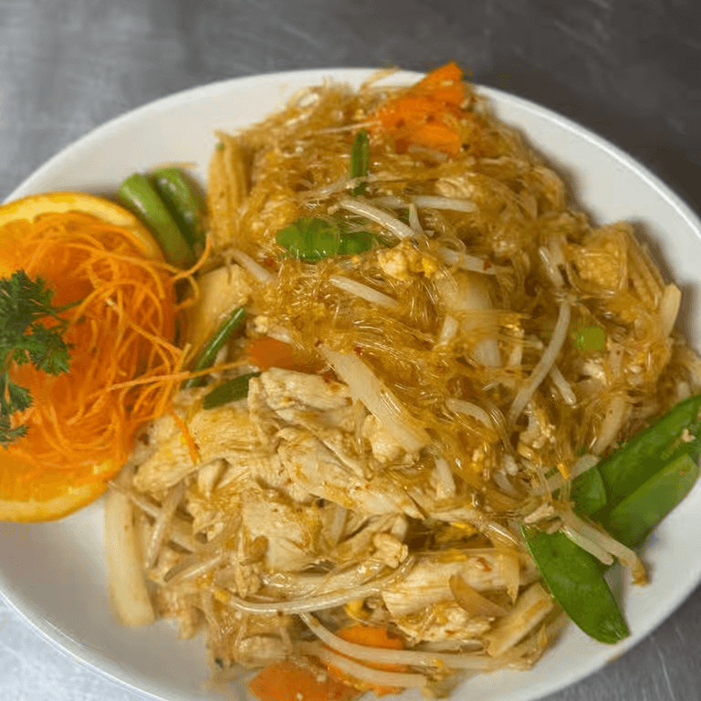 Choice of Meat clear noodle stir fried with egg, bean sprout, onions, cabbage, carrot, baby corn, snow peas, celery, mushroom, zucchini, bell pepper
