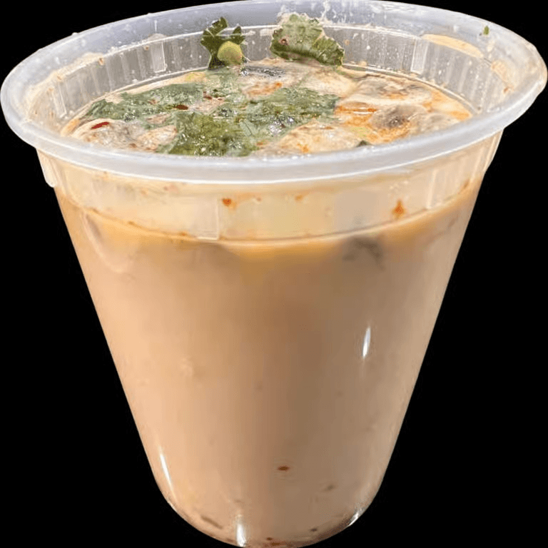 Thai soup made with galangal, lime leaves, basil, lemongrass, mushrooms, tomatoes, chili, garnished with onions and cilantro